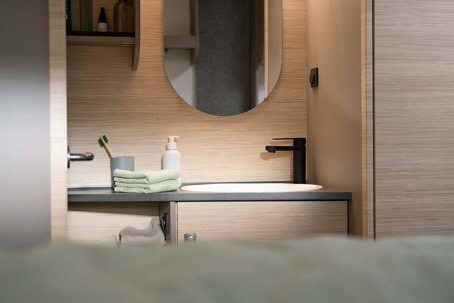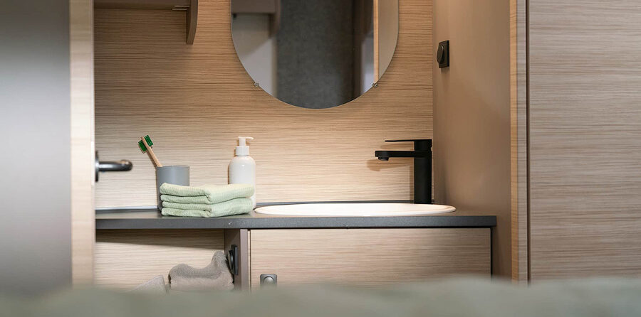 Umywalka z półkami, szafką łazienkową i podświetlanym lustrem